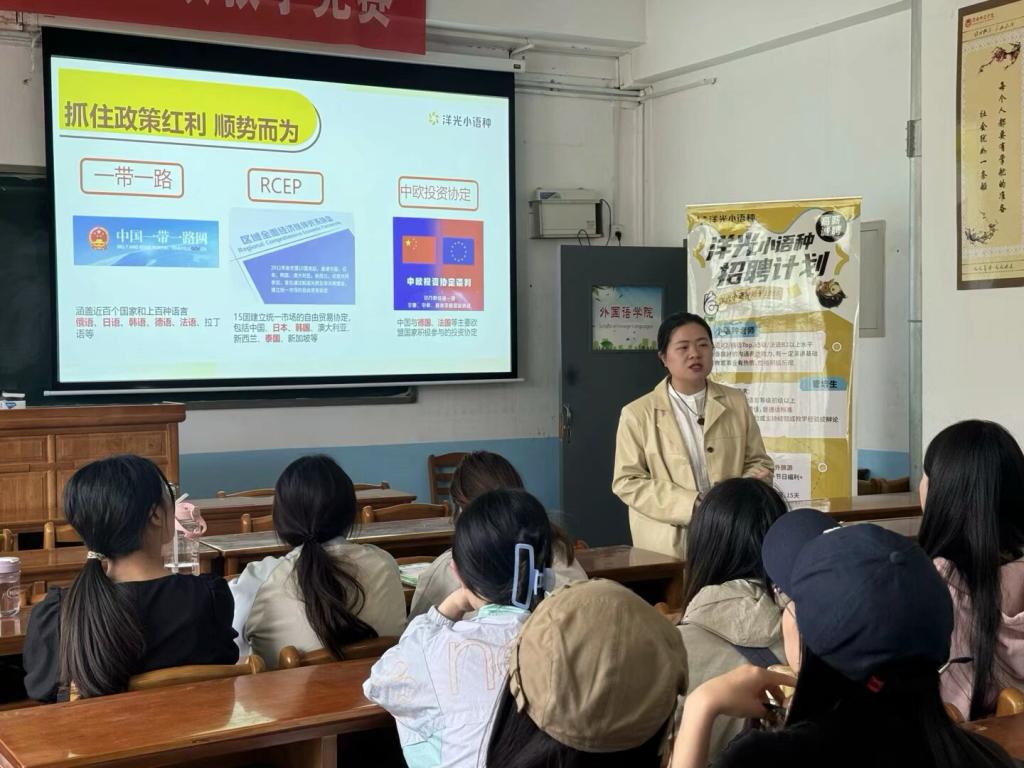 在宣讲招聘环节,洋光小语种西安分校校长林文婷从企业发展历程、业务范围、岗位需求、薪资待遇等方面作了详细介绍。她结合当前语言服务行业发展趋势,为学生们分析了职业发展路径,并分享了语言教学经验。在互动环节,学生们就岗位要求、职业发展等问题踊跃提问,林校长一一给予解答。宣讲结束后,企业现场组织了面试,多名学生达成初步就业意向。