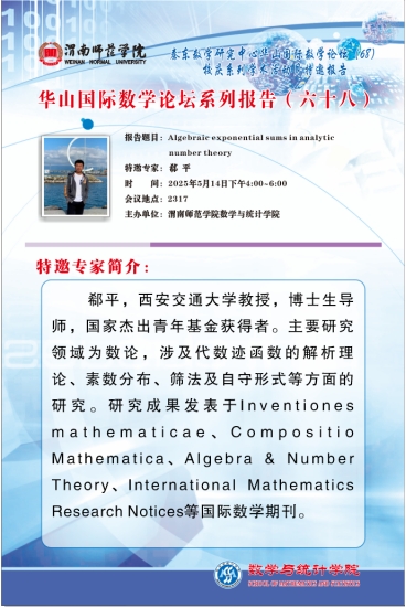 5月14日下午,数学与统计学院邀请西安交通大学国家级人才郗平教授在2317教室为师生带来一场题为“Algebraic exponential sums in analytic number theory”的学术报告。报告会由副院长赵教练主持,数论与模形式团队、青年博士教师与数学专业的学生参加本场报告。