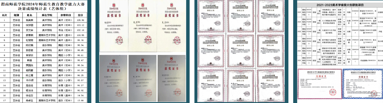 美术学专业:2025年美术学学生获第四届陕西省高校师范生教育教学能力大赛一等奖;2022—2023学年美术学学生获渭南市“聚力”杯书画比赛中获三等奖;获第四届陕西省高校师范生教育教学能力大赛二等奖;2024-2025学年,美术学学生入选中国高校美术作品展;2024-2025全国高校商业精英挑战赛品牌策划竞赛国赛三等奖(项目负责人)省级荣誉;2024-2025学年美术学学生全国大学生电子商务“三创”大赛省赛入围(项目负责人);2024-2025学年第四届陕西省高校师范生教育教学能力大赛 一等奖;2023-2024学年 大学生创新创业项目 省级立项(项目负责人);2024-2025学年美术学学生获第二届全国大学生职业规划大赛校赛铜奖。众多学生在毕业后投身教育、艺术创作等领域,以扎实的专业技能和良好的品德作风赢得社会赞誉。