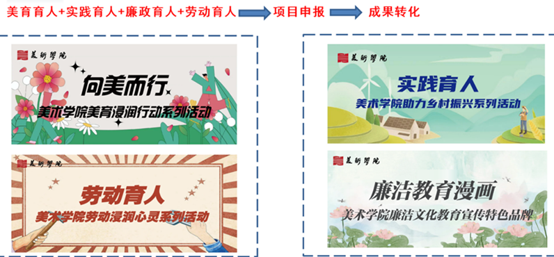 学院推出了“向美而行/美术学院美育浸润行动系列活动”“实践育人/美术学院助力乡村振兴系列活动”“劳动育人/美术学院劳动浸润心灵系列活动”“美术学院廉洁文化教育宣传特色品牌/廉洁教育漫画”四个特色品牌,又凝练了“大数据背景下构建美术学院产教融合育人体系探索与实践”的研究方向。