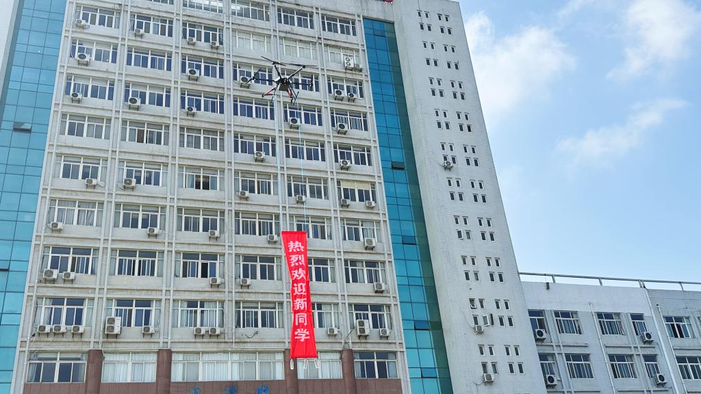 9月13日,我校迎来了2025级新生入学报到。继续教育学院别出心裁,利用无人机在学校主楼厚德楼上空悬挂“欢迎新同学”条幅,以创新科技的方式向新生表达期待与欢迎。