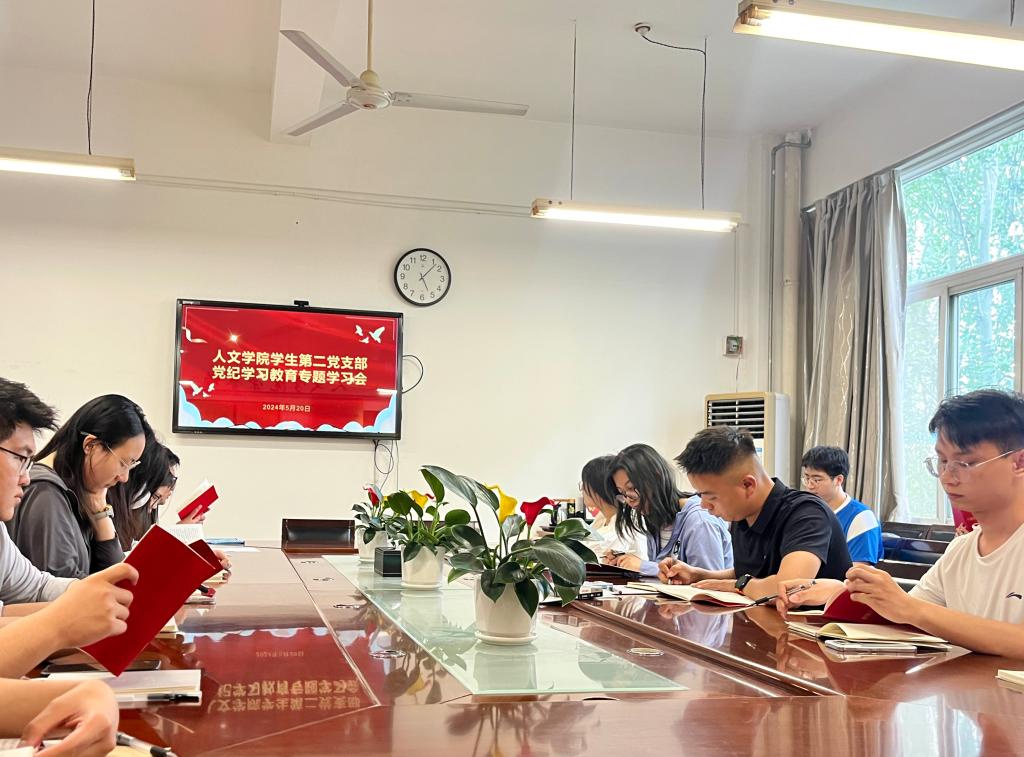 5月20日下午,人文学院学生第二党支部在博识楼1318会议室召开党纪学习教育专题学习会,会议由组织委员杨帆主持,人文学院党总支书记张晶、支部书记孟子祥、宣传委员王乐靖及支部全体学生党员参会。