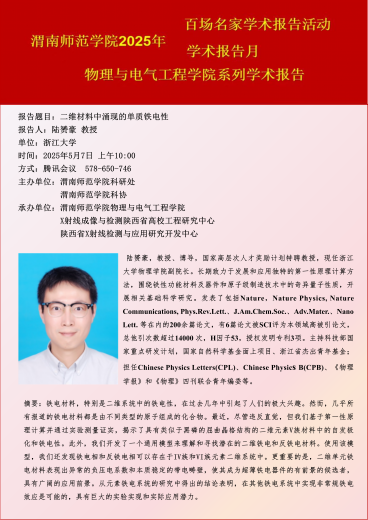 5月7日,在学校65周年校庆来临之际,欧宝娱乐官方app科研处、欧宝娱乐官方app科协联合欧宝娱乐官方app物理与电气工程学院、X射线成像与检测陕西省高校工程研究中心、陕西省X射线检测与应用研究开发中心举办百场名家学术报告活动。本次活动邀请浙江大学陆赟豪教授做学术交流。报告交流题目为:二维材料中涌现的单质铁电性。