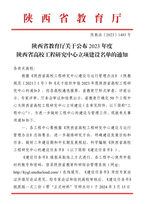 近日,陕西省教育厅发布了《关于公布2023年度陕西省高校工程研究中心立项建设名单的通知》(陕教函〔2023〕1483号)文件,我校物理与电气工程学院何冰教授牵头申报的“X射线成像与检测陕西省高校工程研究中心”获批立项建设。