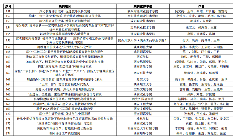 据悉,2020年中共中央、国务院印发了《深化新时代教育评价改革总体方案》(中发〔2020〕19号),中共陕西省委教育工委、陕西省教育厅制定了落实该方案的具体举措,学校制定了详细的实施方案,明确了任务清单和责任单位。此次获奖是我校贯彻落实中省文件精神,落实新时代教育评价改革的具体成果,为我校进一步深化教育评价改革,创新人才培养模式,提高人才培养质量,创造了良好基础。(通讯员 吕海波 审核人 徐军义)