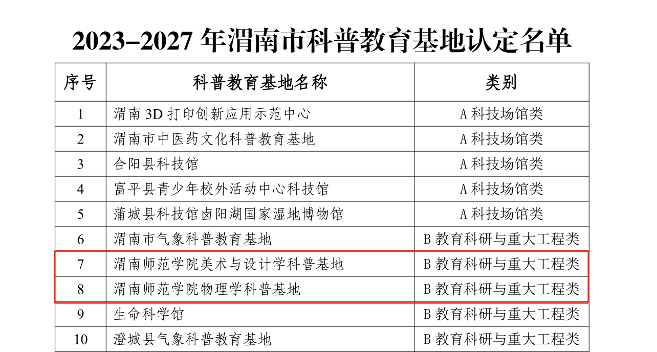 近日,渭南市科学技术协会、渭南市科学技术局发布《关于认定“2023-2027年渭南市科普教育基地”的通知》(渭科协发[2023]37号),我校美术学院、物理与电气工程学院申报的美术与设计学科普基地、物理学科普基地获批教育科研与重大工程类“渭南市科普教育基地”。